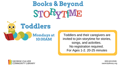 Toddlers and their caregivers are invited to join storytime for stories, songs, and activities. No registration required. For Ages 1-2. 20-25 minutes.