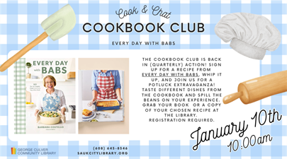 The cookbook club is back in action! Sign up for a recipe from this quarter’s cookbook, whip it up, and join us for a potluck extravaganza! Taste different dishes from the cookbook and spill the beans on your experience. Grab your book or a copy of your chosen recipe at the library. Registration is required. Register by phone or at the library.