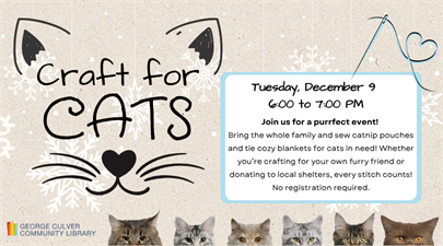Join us for a purrfect event! Bring the whole family to our library and help sew catnip pouches and tie cozy blankets for cats in need! Whether you’re crafting for your furry friend or donating to local shelters, every stitch counts! No registration required.