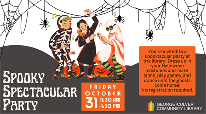 You’re invited to a spooktacular party at the library! Dress up in your Halloween costumes and make slime, play games, and dance until the ghosts come home!